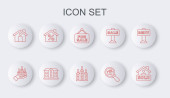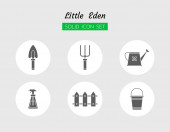 zestaw symboli stałych ikon, koncepcja narzędzi wzrostu roślin, spray wodny, rękawica, but, nasiona, kiełek, łopata, izolowany projekt wektora płaskiego