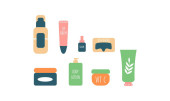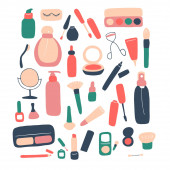 Skóra. Produkty kosmetyczne i akcesoria. Ikony piękna do druku cyfrowego. Cute ręcznie rysowane płaski wektor graficzny.