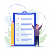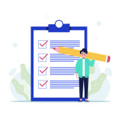 Kobieta z dużym ołówkiem, liśćmi i frontem. Rzeczy do zrobienia na papierze, strona z zadaniami roboczymi w płaskiej ilustracji wektora
