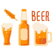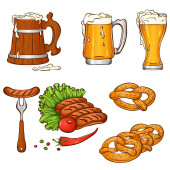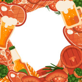 Smażony stek i szklanka piwa na białym odosobnionym tle. Barbeque mięso na zaproszenie lub karty upominkowej, notatnik, logo grill bar, album z wycinkami. Telefon przypadku lub tkaniny druku Płaski styl wektor czas ilustracji