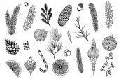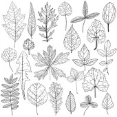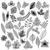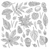 Jesienny zestaw wektorowy z liśćmi, jagodami, szyszkami jodowymi, orzechami i żołędziami. Szczegółowe leśne elementy botaniczne do dekoracji. Dąb, klon, rysunek liści kasztanowca