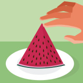 Malutkie postacie cieszące się orzeźwiającym ogromnym dojrzałym arbuzem. Lato, Grupa ludzi jedzących owoce i owocowe lody