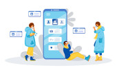 Człowiek z kreskówek rozmawia z lekarzem kobieta w smartfonie z medycznym schowkiem i pozostawia garnek na białym tle.