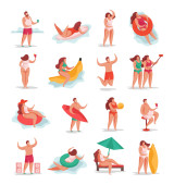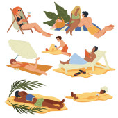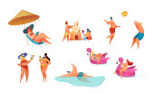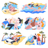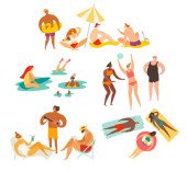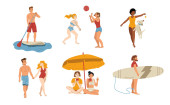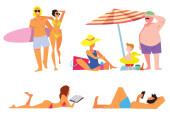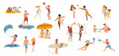 Ludzie spędzają wakacje lub weekendy nad morzem. Pojedyncze postacie opalające się przy słońcu leżące na kocu lub siedzące pod parasolem. Pływak, chodząca rodzina. Rodzice i dzieci na wektorze kurortu