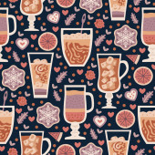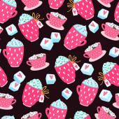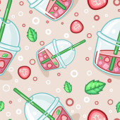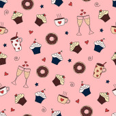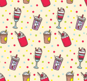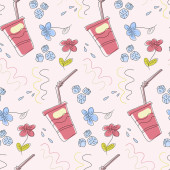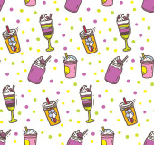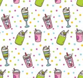 słodkie wektor bez szwu ilustracja ze słodkimi cukierkami, kubki ze słomkami, napoje