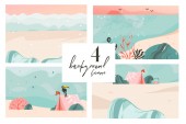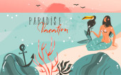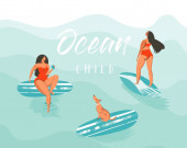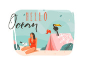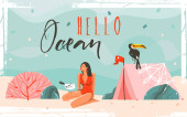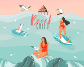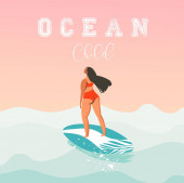 Ręcznie rysowane wektor abstrakcyjny kreskówka lato grafika ilustracje szablon karty z surfing dziewczyna, tukan ptak na niebieskie fale i nowoczesne typografia Cool Sezon odizolowany na różowy zachód słońca tło