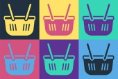 Pop art Zakupy ikona koszyka izolowane na tle koloru. Sklep spożywczy, supermarket. Ilustracja wektora