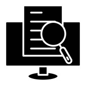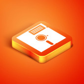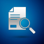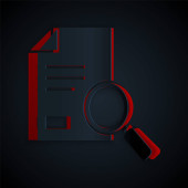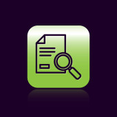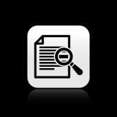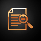 Złoty dokument z ikoną wyszukiwania na czarnym tle. Plik i ikona szkła powiększającego. Znak badań analitycznych. Ilustracja wektora