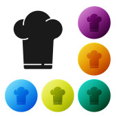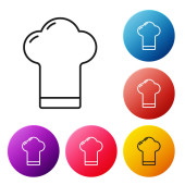 Czarna linia Chef kapelusz ikona izolowane na białym tle. Symbol gotowania. Kapelusz kucharza. Zestaw ikon w kolorach kwadratowych przycisków. Ilustracja wektora