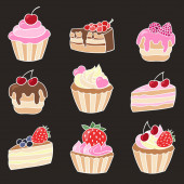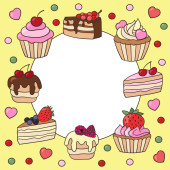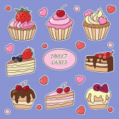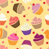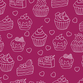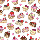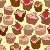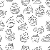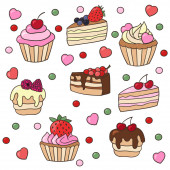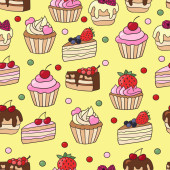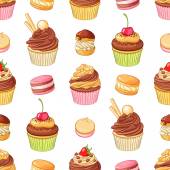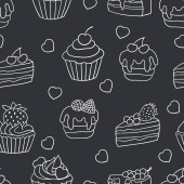 Wektor bezszwowy wzór z słodkie słodkie słodkie babeczki i ciasta na niebieskim tle. Do projektowania i dekoracji opakowań, okładek i nadruków tekstylnych