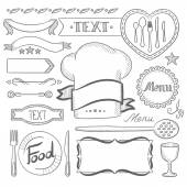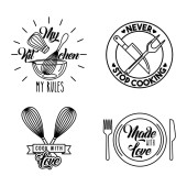 kolekcja logo kuchni i gotować z fartuch, patelnia, grzyb, garnek, widelec, noż.Wektor ilustracji ikona, logo, naklejka, druk i tatuaż