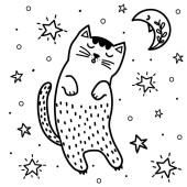 Halloween dekoracyjne ilustracja astrolog czarownik kot z gwiazdami na białym tle. Rysunek ręcznie wektor doodle czarny magiczny kot czyta gwiazdy. Pocztówka dekoracje halloween.