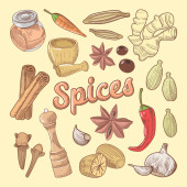 Spice Condiment Ziołowa kolekcja ikon zestaw wektor. Sól i pieprz do przypraw Posiłek w kuchni Utensil. Przyprawa na łyżce i kolor dłoni Kontur ilustracje