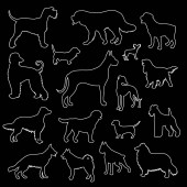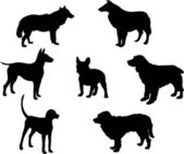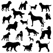 Wektor czarne sylwetki psów różnych ras: wielki Dane, Dachshund, Owczarek niemiecki, Rottweiler, husky, chart, Fox Terrier, seter, bokser na białym tle