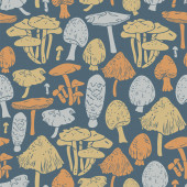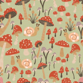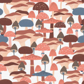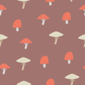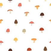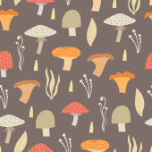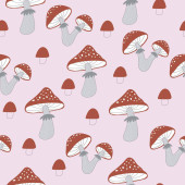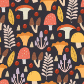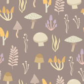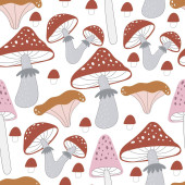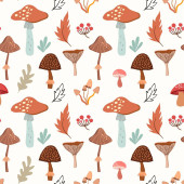 bezproblemowy wzór z grzybami, roślinami, tęczami, elementami dekoracyjnymi na neutralnym tle. Las, prosty wektor płaski. Rysunek dłoni. projekt tkaniny, nadruku, opakowania