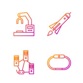 Zestaw linii Robotic robot ręka fabryki, Statek rakietowy z ogniem, Bezprzewodowa ładowarka i ekspres do kawy. Ikony kolorów gradientu. Wektor.