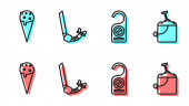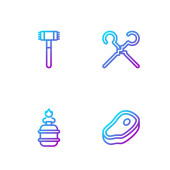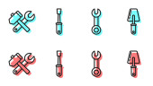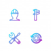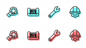 Ustaw linię Hełm bezpieczeństwa pracowników, hełm bezpieczeństwa pracowników, Klucz młotka i klucza i ikona zamkniętych drzwi. Wektor.
