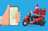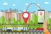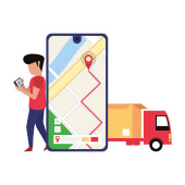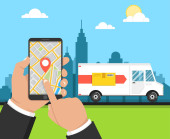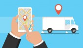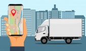 Samochód dostawczy i smartfon z aplikacją nawigacyjną.