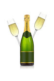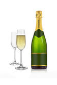 Zielona butelka szampana ze złotą folią na izolowanym białym tle.Szklanki szampana.Ilustracja do sieci, plakat, zaproszenie na imprezę. Ilustracja wektora.