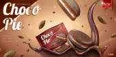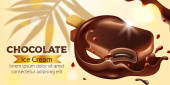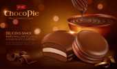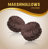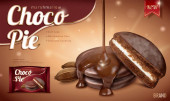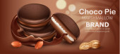 Całe i połówki piankowych placków czekoladowych i orzeszków ziemnych objętych roztopioną czekoladą. Realistyczne. Umiejscowienie produktu 3D makieta. Miejsce na tekst