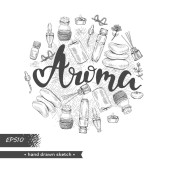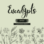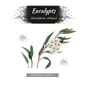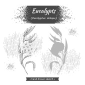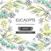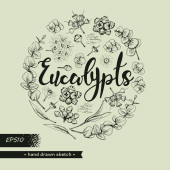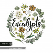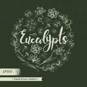 Koło wypełniło liście eukaliptusa, młode pędy i gałęzie eukaliptusa kwiatami, pączkami i nasionami oraz literami Eukaliptusa. Szczegółowe ręcznie rysowane szkice, ilustracja wektorowa botaniczna.