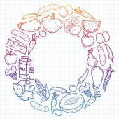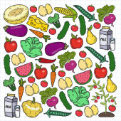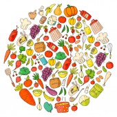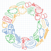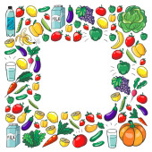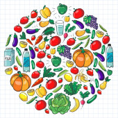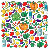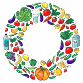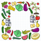 Wzór wektora. Zdrowa ekologiczna żywność. Warzywa, owoce, mleko mleczne