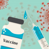Ilustracja szczepionki koronawirusowej i strzykawki z igłą. Tło 3D renderowania mikroskopowy widok pandemii koronawirusa.
