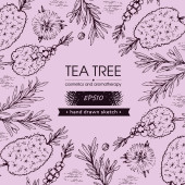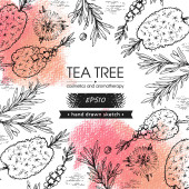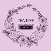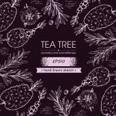 Ramka z gałęzi z liści i kwiatów drzewa herbacianego. Szczegółowe ręcznie rysowane szkice, ilustracja wektorowa botaniczna.