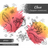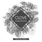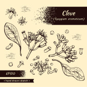 gałęzie goździka z liśćmi, pączkami i kwiatami. Szczegółowe ręcznie rysowane szkice, ilustracja wektorowa botaniczna.
