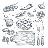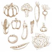 Świeże warzywa na farmie. Ilustracja szkicu wektora. Ręcznie rysowane pojedyncze brokuły, dynia, szparagi, karczochy, kalarepa. Jesienna hodowla i zbiory.
