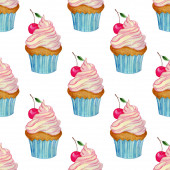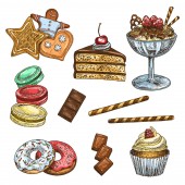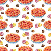 Zestaw słodyczy zawiera filiżankę herbaty, placek wiśniowy, lizaka, pączki, pierniki i karmelki. Ilustracja akwarela izolowane na białym tle. Rysowany ręcznie.