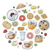 Zdjęcie "Gotowanie śniadanie, wektor top view kolor szkic ilustracja. Zestaw ręcznie narysowanych porannych posiłków. Restauracja lub kawiarnia brunch menu elementy projektu." może być wykorzystywane do celów osobistych i komercyjnych zgodnie z warunkami zakupionej licencji Royalty-free. Obraz jest dostępny do pobrania w jakości wysokiej rozdzielczości do 5760x3840.