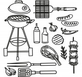 BBQ i grill wektor szkic ilustracji. Zestaw do grillowania, izolowany na białym tle. Żywność, sprzęt i narzędzia. Elementy projektu menu piknikowego.