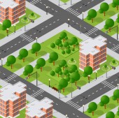 Zdjęcie "Transport ulice miasta skrzyżowania z domami i drzewami. Izometryczny widok z góry na transport miejski" może być wykorzystywane do celów osobistych i komercyjnych zgodnie z warunkami zakupionej licencji Royalty-free. Obraz jest dostępny do pobrania w jakości wysokiej rozdzielczości do 5760x3840.