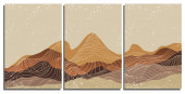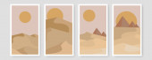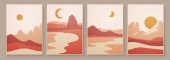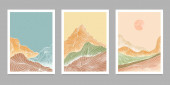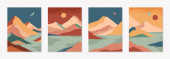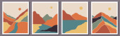 zestaw w połowie wieku nowoczesny minimalista. Abstrakcyjny charakter, morze, niebo, słońce, skalisty plakat krajobrazu górskiego. Geometryczne tło krajobrazu w stylu skandynawskim. Ilustracja wektora