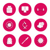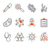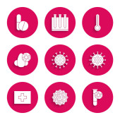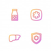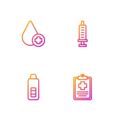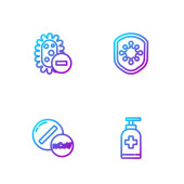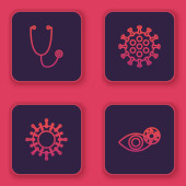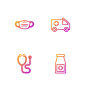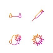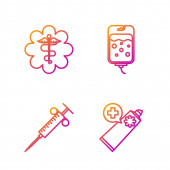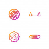 Ustaw linię Termometr medyczny, Wirus, symbol DNA, wirus i stetoskop. Ikony kolorów gradientu. Wektor.