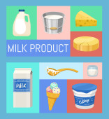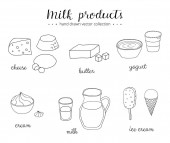 Zestaw mleka, przetworów mlecznych i alternatyw dla mleka wegańskiego. Butelka mleka i pudełko kartonowe, jogurt. Ilustracja wektora narysowanego ręcznie.