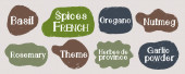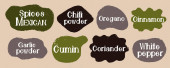 Tekst mowy lable kuchni zestaw przypraw. Nazwa projektu kolekcji.