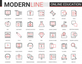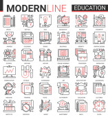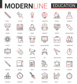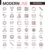 Koncepcja kompleksu edukacyjnego cienka czerwona czarna linia wektor zestaw ikon z zarysem szkoły infograficznej, laboratorium lub uczelni, symbole edukacyjne, sprzęt eksperymentalny laboratorium, podręcznik szkolny i papeteria.