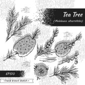 Kolekcja gałęzi z liśćmi i kwiatami drzewa herbacianego. Szczegółowe ręcznie rysowane szkice, ilustracja wektorowa botaniczna.