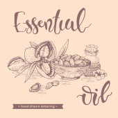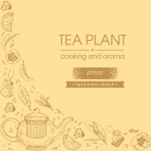 Tło z gałęzi z liści i kwiatów drzewa herbacianego i liternictwa. Szczegółowe ręcznie rysowane szkice, ilustracja wektorowa botaniczna.