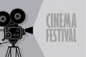 Logo na festiwal kina ze staromodnym projektorem filmowym i napisem kaligraficznym. Ilustracja wektora lub ikona, nadaje się do ulotki, zaproszenie, baner, plakat, strona internetowa, etykieta