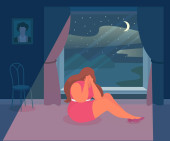 Samotna dziewczyna wyglądająca przez okno na ilustracji Nocy Wektor