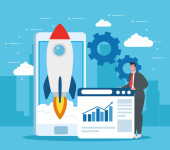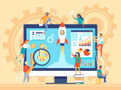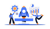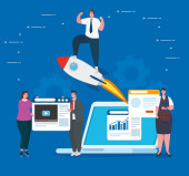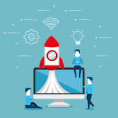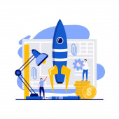 Zdjęcie "Koncepcja start-upu z charakterem. Biznesmen razem wystrzeliwuje rakietę w niebo i planuje udany projekt. Rozpocznij proces uruchamiania pomysłu. Nowoczesny płaski styl strony lądowania." może być wykorzystywane do celów osobistych i komercyjnych zgodnie z warunkami zakupionej licencji Royalty-free. Obraz jest dostępny do pobrania w jakości wysokiej rozdzielczości do 5760x3840.