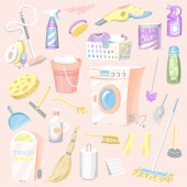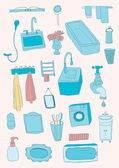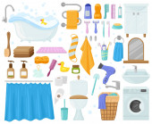 Wnętrze łazienki Narzędzia do kąpieli, przybory toaletowe, wanna, toaleta, pralka i suszarka. Zestaw symboli wektorów wyposażenia wnętrz łazienki