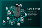 Koncepcja zarządzania siecią danych. Wektorowa mapa izometryczna z serwerami sieci biznesowych komputerów i urządzeń.Przechowywanie w chmurze danych i synchronizacja urządzeń. Styl izometryczny 3d