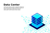 Koncepcja zarządzania siecią danych. Wektorowa mapa izometryczna z serwerami sieci biznesowych komputerów i urządzeń.Przechowywanie w chmurze danych i synchronizacja urządzeń. Styl izometryczny 3d