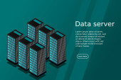 Koncepcja zarządzania siecią danych. Wektorowa mapa izometryczna z serwerami sieci biznesowych komputerów i urządzeń.Przechowywanie w chmurze danych i synchronizacja urządzeń. Styl izometryczny 3d
