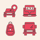 Ustaw wskaźnik mapy z taksówką, Klucz samochodowy z pilotem, Kolejka linowa i ikona dachu samochodu Taxi. Wektor.
