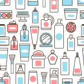 Półka z kosmetykami: szampony, płyny, mydło w płynie i pasta do zębów. Sklep. Wektor płaska ilustracja. Płynne tło. Wzór.